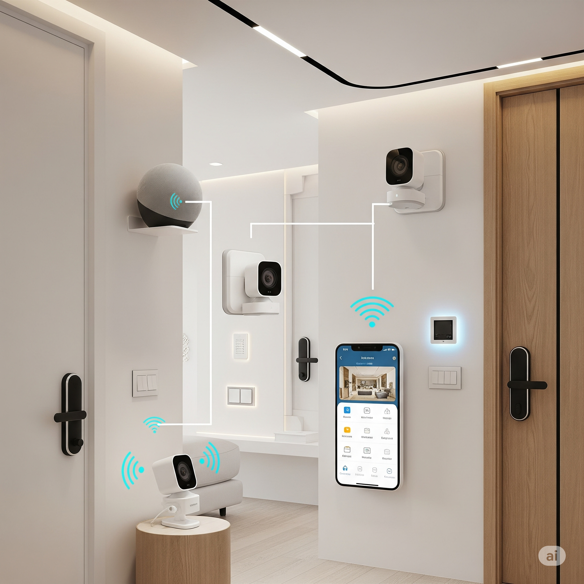 Transforme seu lar com assistentes de voz, câmeras Wi-Fi, sensores de portas/janelas, fechaduras e interruptores inteligentes, tudo controlado pelo seu celular.